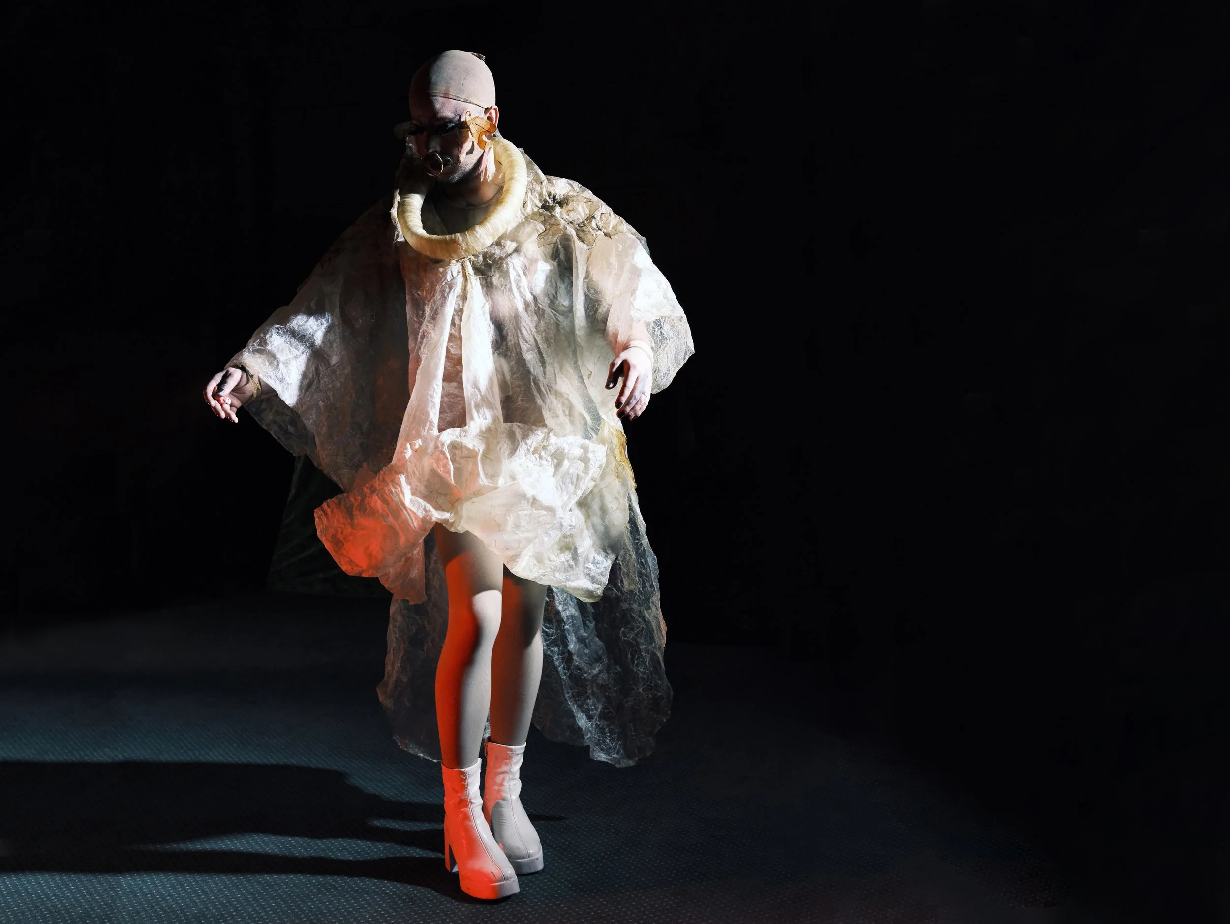 En parallèle de ses projets design, Thibault Philip développe également des projets plus artistiques. Il a notamment réalisé un costume de scène pour la drag Queen Gorki Gore. Jouant sur la connotation “étrange” de la matière première, il a développé une matière très fine à l’aspect vaporeux qui contraste avec la gestuelle plutôt brusque de la drag Queen. Sa performance est marquée par le bruissement de la matière, accentuant son côté vivant.