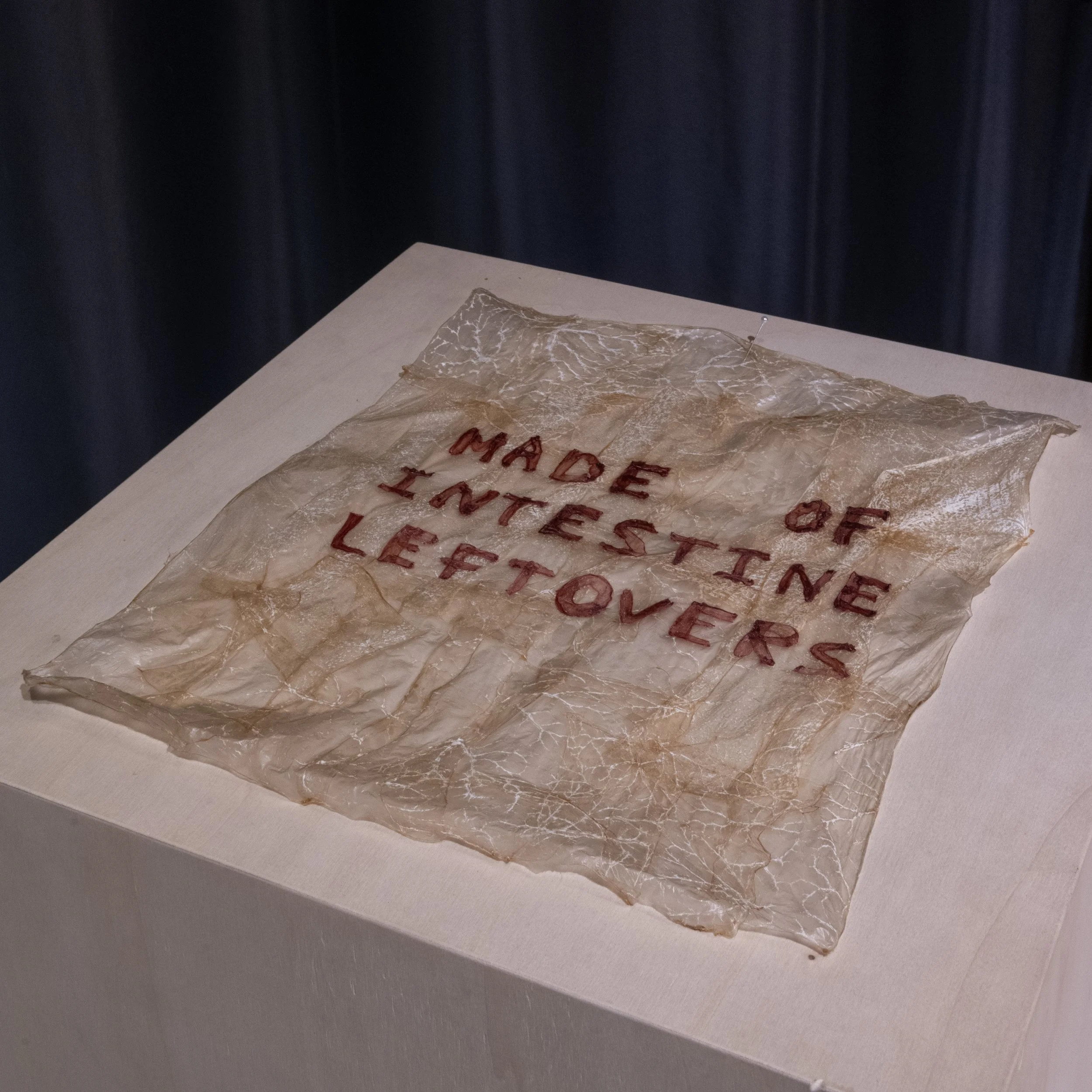 Le travail de cette matière lui permet de redessiner un certain lien entre l’humain et l’animal, entre l’exploitant et l’élevage. Il permet de renouer avec des pratiques artisanales telles que celle des inuits qui transforment l’intégralité des animaux tués. Les intestins des animaux marins deviennent ainsi des cordages pour des bateaux ou des instruments de musique.